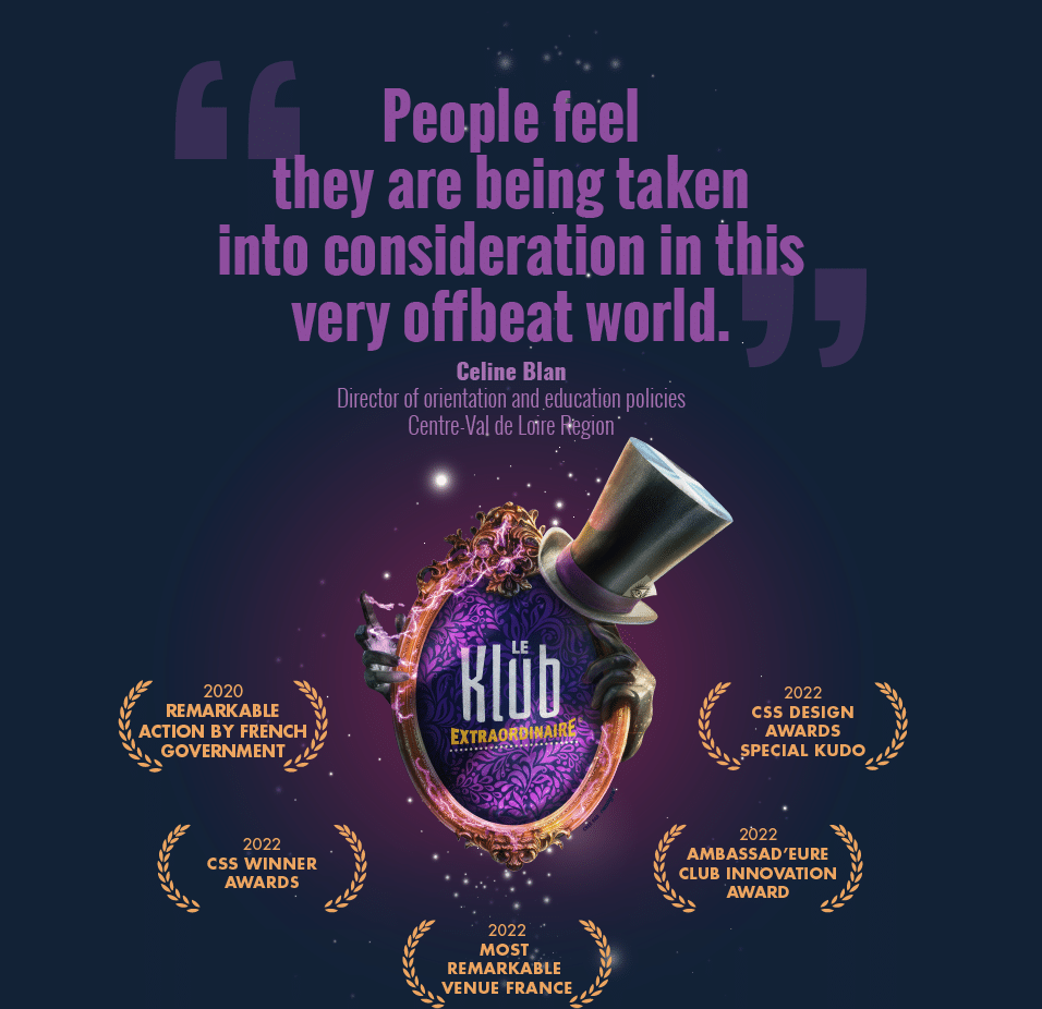 This quest for French excellence has been rewarded with several national and international awards, including, in 2020, the “remarkable action” label – a distinction awarded by the French government. And more recently, alongside other big names in the Location based Entertainment industry, such as the Fondation Louis Vuitton, Le Futuroscope and Le Puy du Fou, Le Klub Extraordinaire was awarded the Hidden Gen France 2022 prize in the Remarkable Venue Awards, a competition which recognizes the best museums and tourist attractions in many countries around the world.